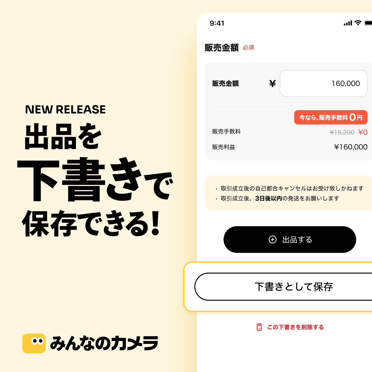 この度、出品時に途中まで入力した内容を「下書き」として保存できるようになりました!写真の選定や商品説明の入力を、自分のペースで進められます。